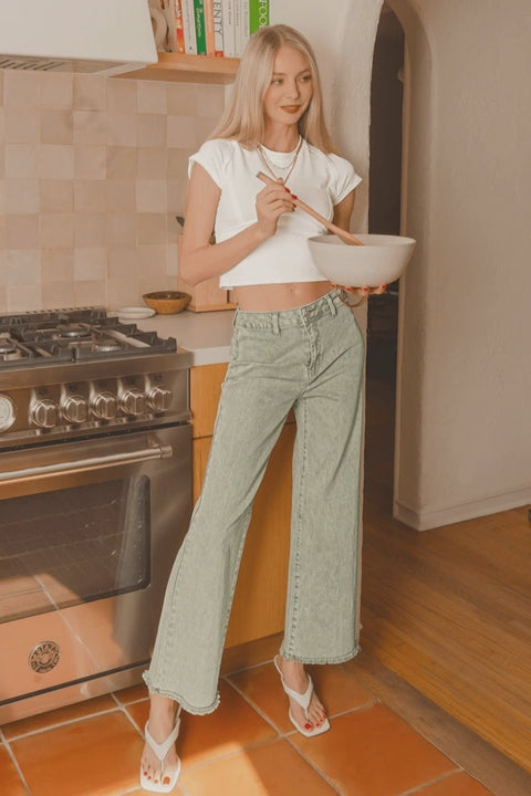 Zenana Acid Washed Frayed Cutoff Hem Straight Wide Pants