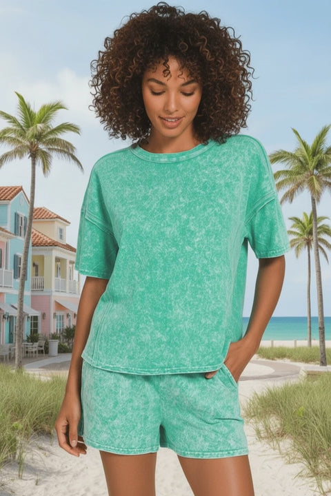 Zenana Halo Snow Washed Short Sleeve and Shorts Set